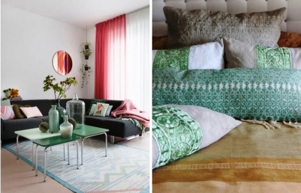 Такая гамма будет уместна практически в любой комнате от прихожей до детской и ванной. И совсем необязательно это должны быть ковры, подушки, покрывала, мебель или стены. Достаточно разбавить комнаты вазонами с растениями или же другими элементами декора и тогда в вашей обители на долгое время поселится весна.