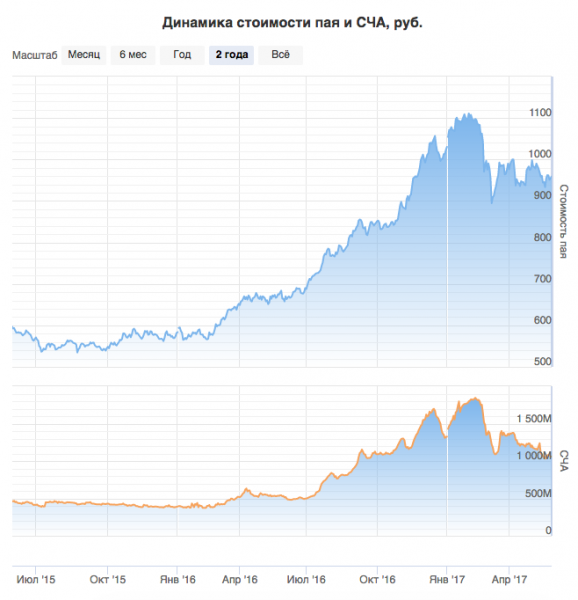 СЧА изменяется под влиянием двух факторов: изменение рыночной стоимости активов в составе портфеля фонда и приток/отток средств пайщиков в фонд. Расчетная стоимость пая зависит только от изменения рыночной стоимости активов. Если сравнить динамику обоих показателей, можно узнать, насколько вкладывают ли инвесторы средства или забирают их из фонда. То есть, насколько привлекательным является данный фонд с точки зрения рынка.